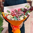 Букет красных альстромерий, роз и зелени