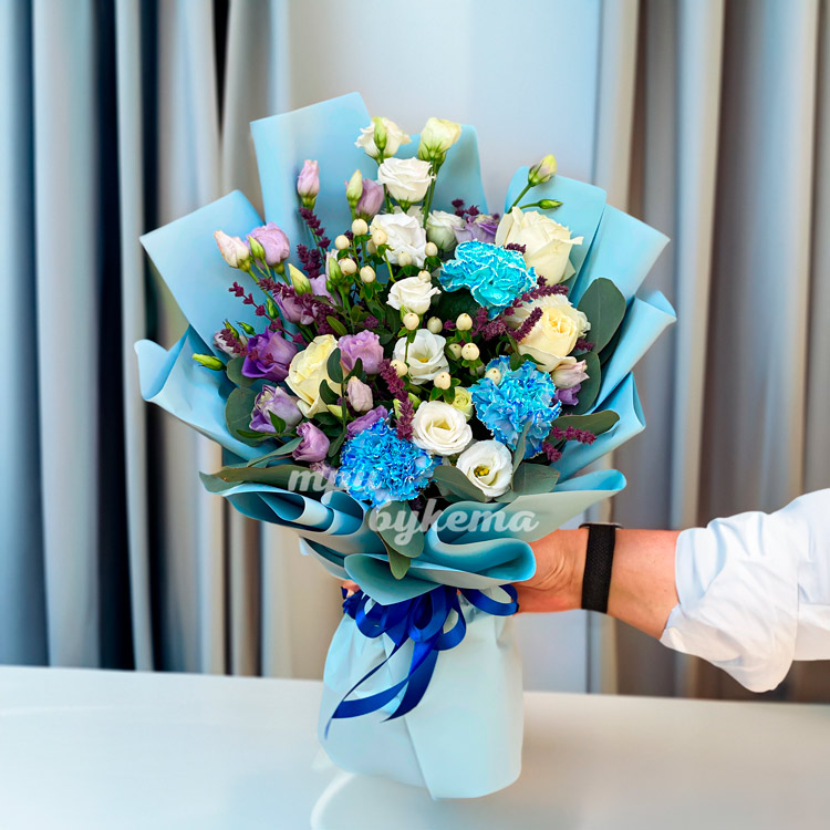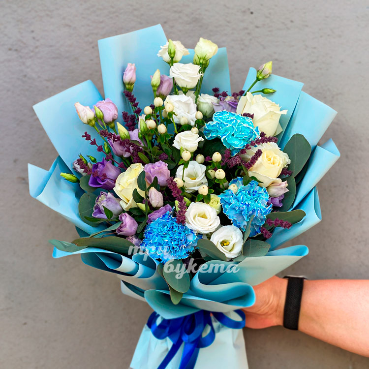 Букет голубых гвоздик с эустомами