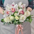 Букет гортензий, маттиол и персиковых роз