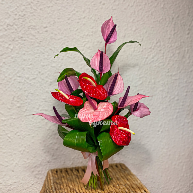 Букет из розовых и красных антуриумов