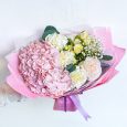 Букет ярких пионовидных роз с гортензией