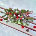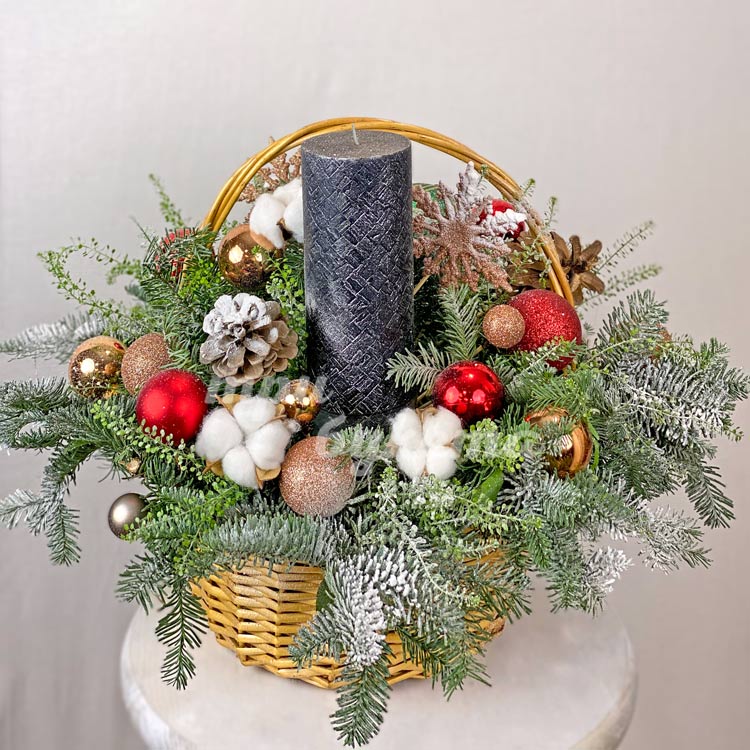 Елочные украшения и свеча в корзине