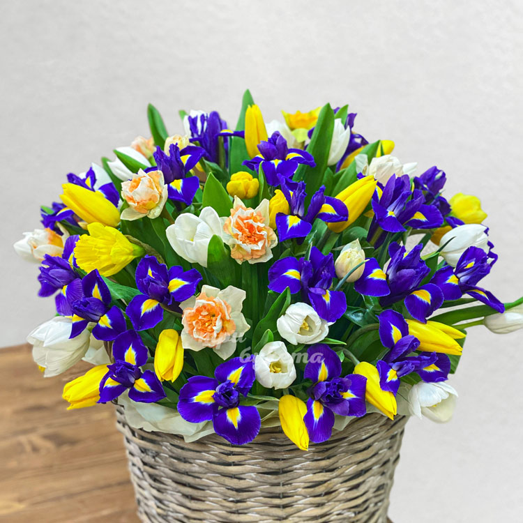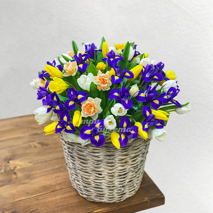 Ирисы, тюльпаны и нарциссы в корзине