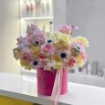 Коробка белых хризантем и гипсофил