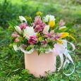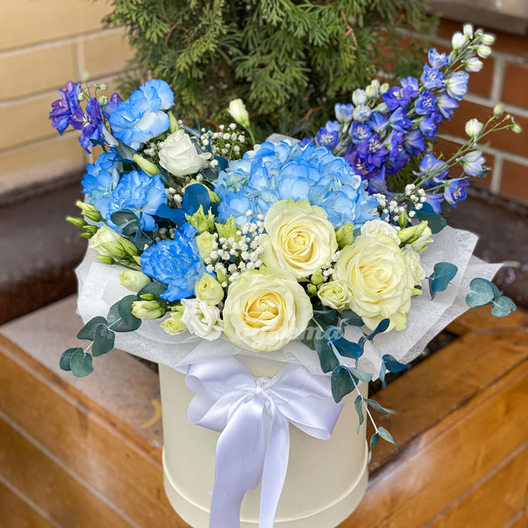 Коробка с эустомами, гвоздиками и розами