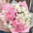 Корзина белых орхидей и розовых роз