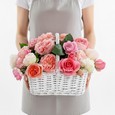 Корзина эустом, гортензий и пионов