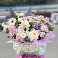 Корзина ранункулюсов, роз и гвоздик
