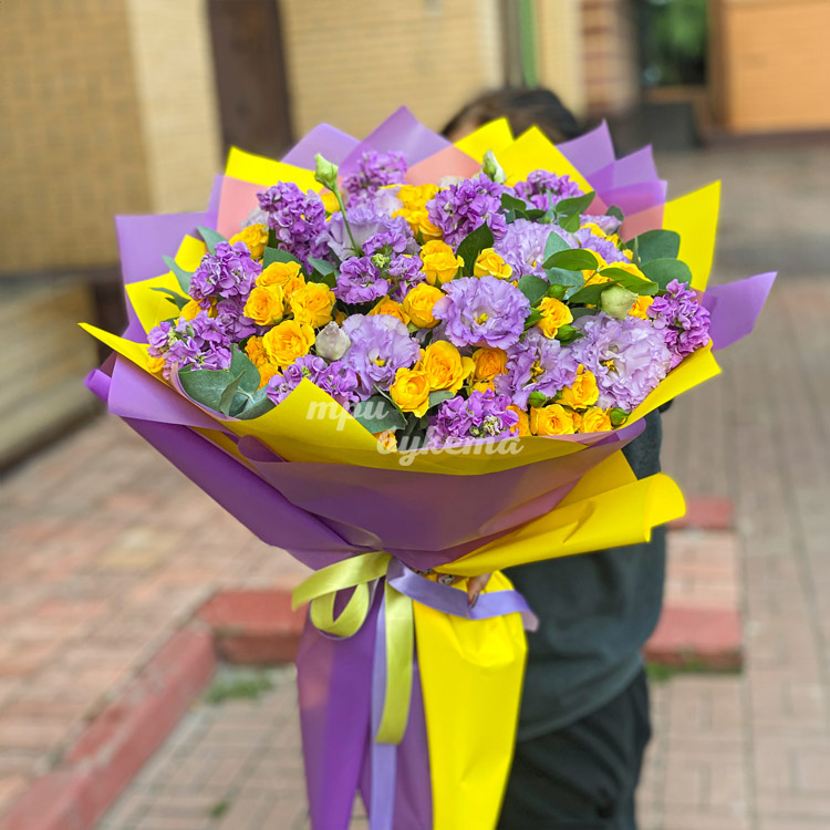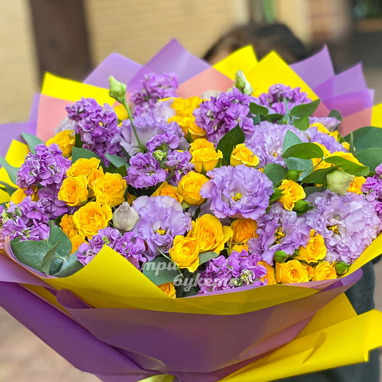 Сиреневые маттиолы и желтые куст. розы